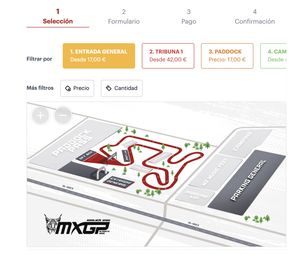 2. En la parte de abajo del texto de descripción encontraras la sección de selección por tipo de entrada (Entrada General, Tribuna, Paddock, Camping, Parking VIP, MX Music Fest y VIP Village.) distinguiéndose por colores junto a un mapa de localización orientativo para cada una de ellas.