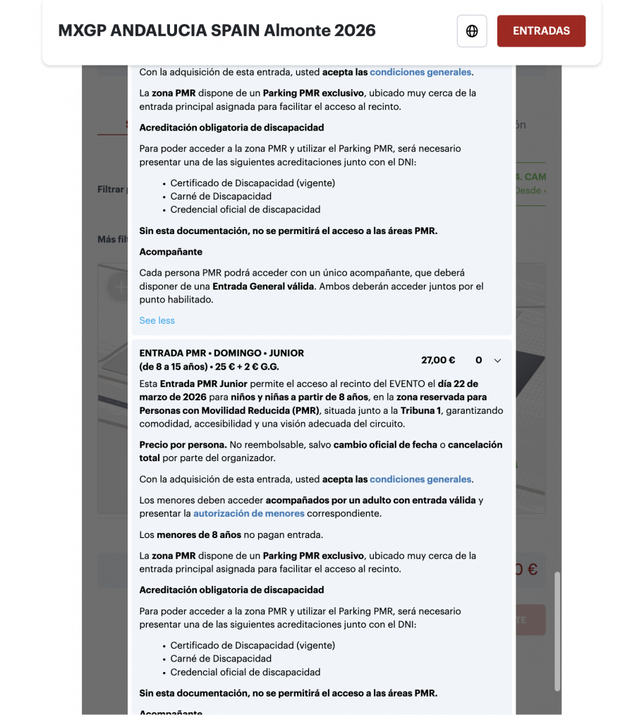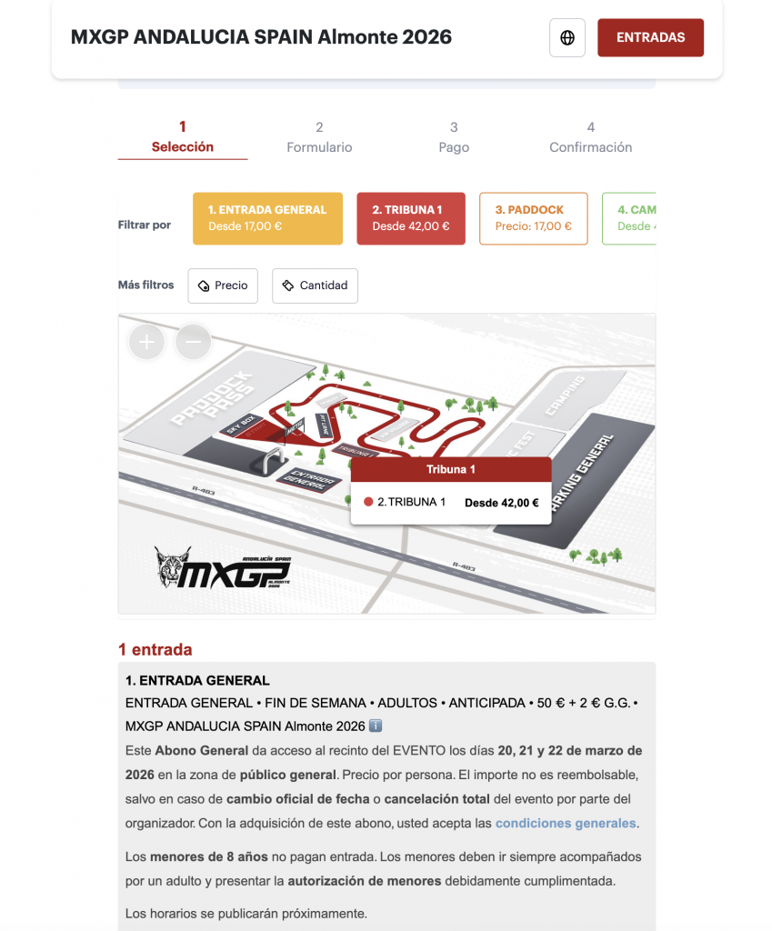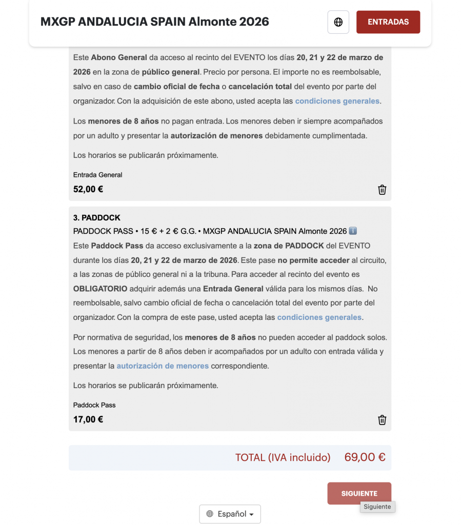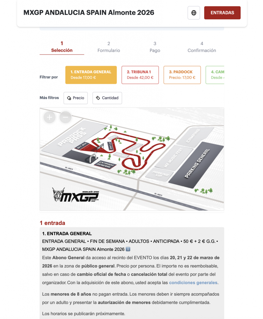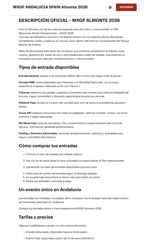 - Entra en nuestra ticketera oficial del evento (www.my.weezevent.com/mx-gp-andalucia-spain-almonte-2026)y lea detenidamente la descripción en la parte superior de la pagina: aquí encontrarás toda la información necesaria.