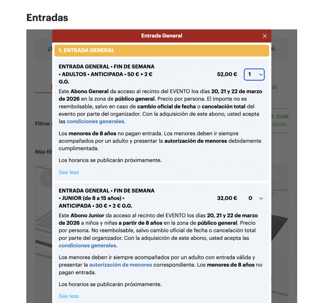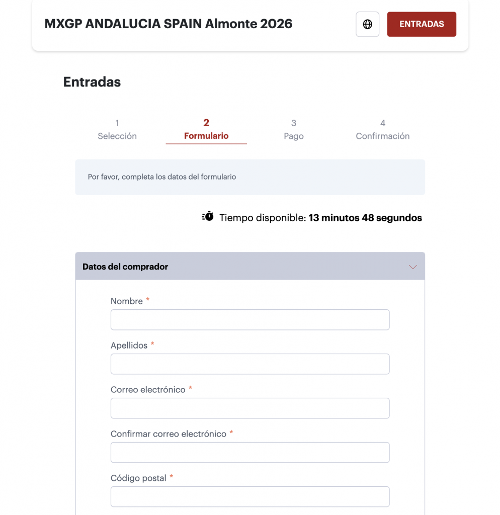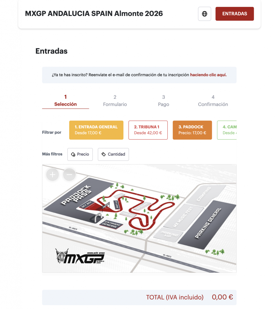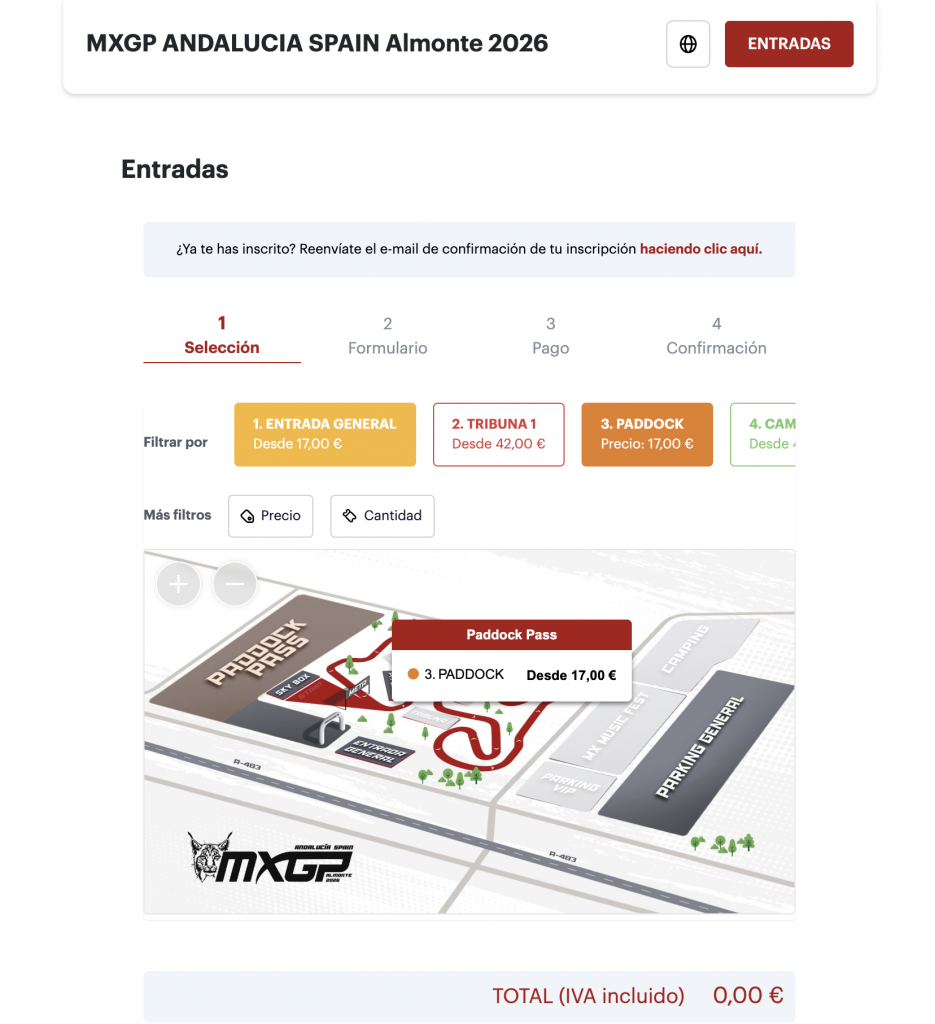 - Entra en nuestra ticketera oficial del evento (www.my.weezevent.com/mx-gp-andalucia-spain-almonte-2026)y lea detenidamente la descripción en la parte superior de la pagina: aquí encontrarás toda la información necesaria.