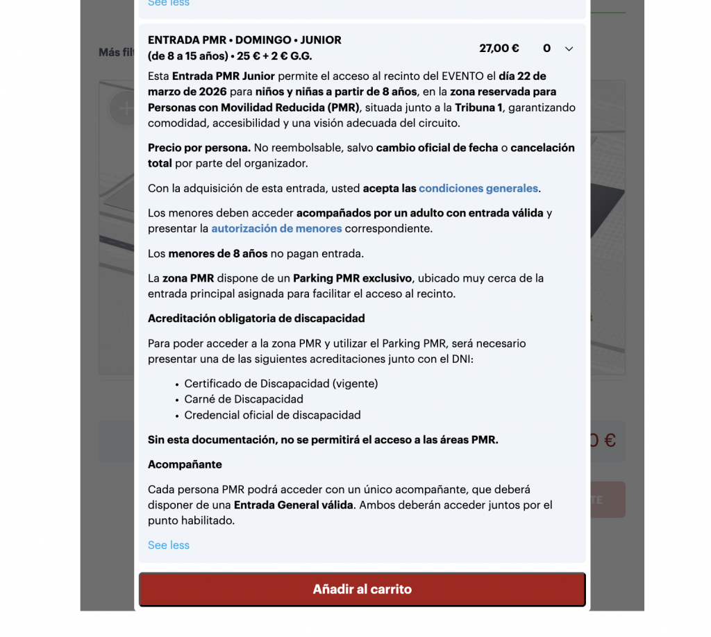 4. Una vez seleccionado la zona de entrada deseada, encontrarás los distintos tipos de entradas que existen en cada zona deseada (Abono 3 días, de día, Junior o PMR), solo tendrás que seleccionar el numero de entradas que necesites (unid/persona), abajo de cada titulo encontrarás toda la información necesaria.