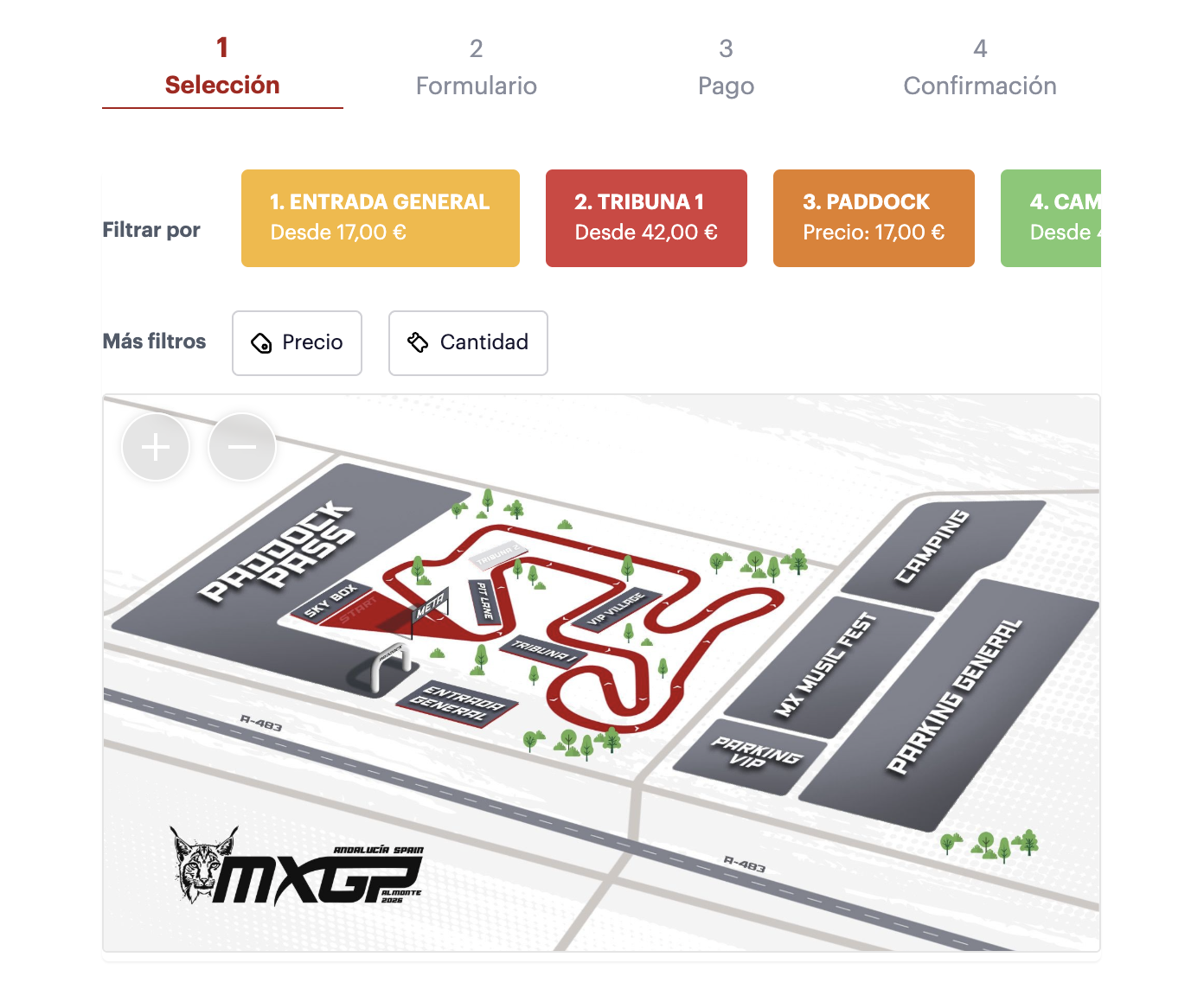2. En la parte de abajo del texto de descripción encontraras la sección de selección por tipo de entrada (Entrada General, Tribuna, Paddock, Camping, Parking VIP, MX Music Fest y VIP Village.) distinguiéndose por colores junto a un mapa de localización orientativo para cada una de ellas.